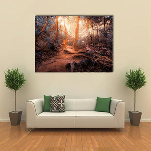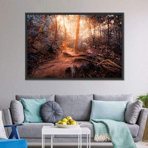 Forest path and trees bathed in glowing sunlight, reimagined with surreal orange, blue, brown, and white hues. The abstract, modern composition emphasizes depth and exposed roots for an ethereal, mysterious, and tranquil atmosphere, suitable for modern or nature-inspired rooms.
