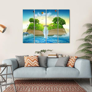 Explore a whimsical realm where an open book spills forth a vibrant waterfall. This dreamy artwork features playful dolphins, gentle deer, and colorful hot air balloons against a serene sky, perfect for adding a touch of fantasy to any space.