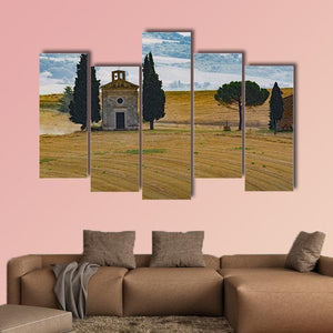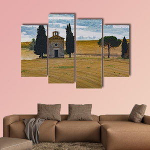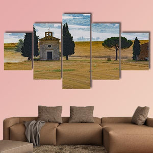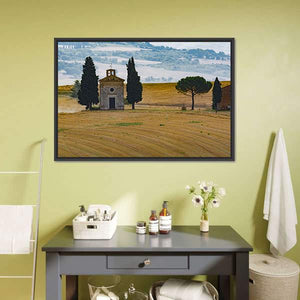 A sunlit pastoral scene centered on a small stone chapel framed by tall cypress trees, a harvested wheat field, and rolling hills in hazy summer light. The composition feels peaceful and vintage, bringing a calm, rustic mood that suits farmhouse or country-style rooms.