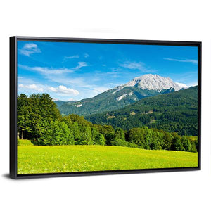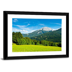 A photorealistic view of the Bavarian Alps with a snow-capped peak above a lush green meadow, trees, and a blue summer sky with soft clouds. The scene reads serene, peaceful, and quietly majestic, composed with depth and a rule-of-thirds balance. A calm choice for living rooms, offices, or other rooms seeking nature-focused wall art.