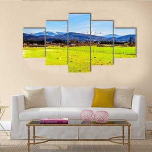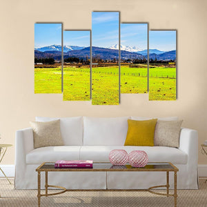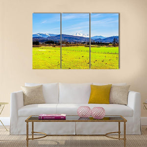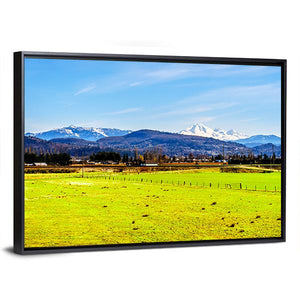 This print captures green fields and a low wooden fence with Mount Baker’s snow-capped peaks rising under a clear blue sky. The wide, peaceful scene—with a distant town at the mountain’s base—brings a calm, expansive mood that fits well in living spaces or nature-focused rooms.