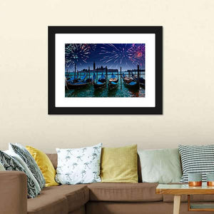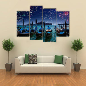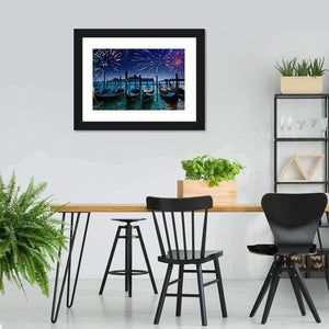 This vibrant canvas artwork captures the festive scene of gondolas drifting under a dazzling display of fireworks in Venice. The photorealistic depiction showcases tall buildings against a backdrop of sparkling water, making it a captivating addition to any space.