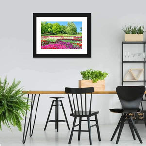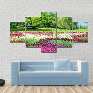 This vibrant canvas features a beautiful field of tulips set against lush green trees and a clear blue sky. Its cheerful and serene mood makes it a delightful addition to any nature-inspired décor.