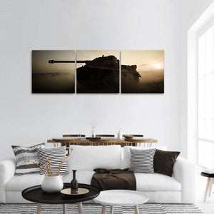 A panoramic canvas of a military tank at night, moving through fog with dust and smoke kicked up by its tracks. Rendered in a photorealistic, cinematic style with brown, yellow, and grey tones, it delivers an intense, atmospheric, historical mood that fits modern or industrial room decor.