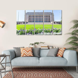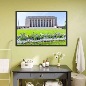 Bring a touch of Finland into your home with this stunning canvas art depicting the grand Finnish Parliament House. The peaceful scene features lush grass, vibrant flowers, and a bright sky, celebrating Neoclassical architecture in a serene, stately composition.