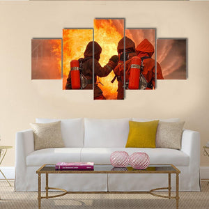 Firefighters In Action Canvas Wall Art shows firefighters in protective gear and oxygen tanks battling a blaze while water sprays across the scene. The dramatic, rule-of-thirds composition and warm orange-red palette create an intense, heroic atmosphere that fits modern home decor or a living room display.