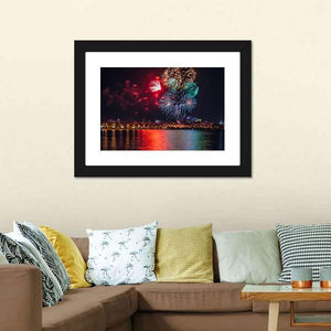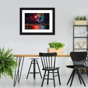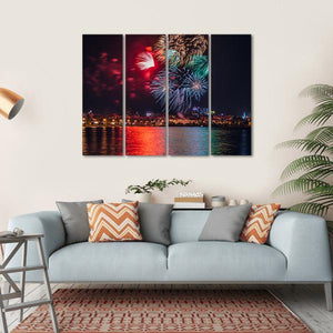 This vibrant canvas art captures the festive spectacle of fireworks shimmering over the Voronezh River. The rich colors of red, blue, and gold reflect off the water, creating a celebratory atmosphere that's perfect for brightening any room.