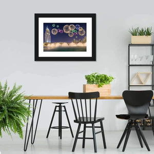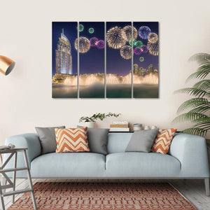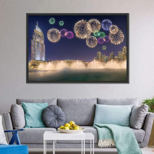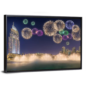 Experience the vibrant energy of Dubai with this stunning canvas featuring fireworks above dancing fountains. The celebratory scene, filled with blue, gold, and purple hues, captures the excitement of a dazzling nighttime event.