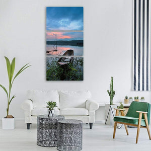 A wooden boat rests among reeds on a calm blue lake at sunset, painted in a realistic landscape with a dramatic pink-and-blue sky. Its serene, peaceful mood makes it a quiet focal point for modern or nature-inspired rooms.