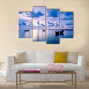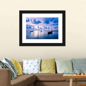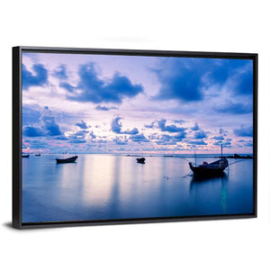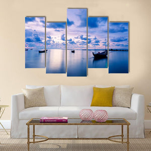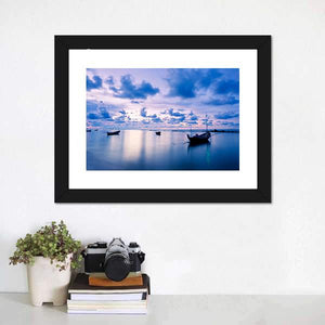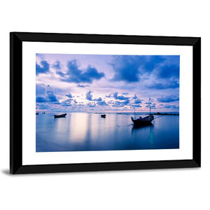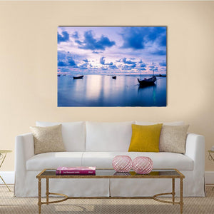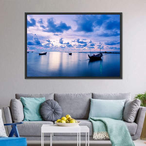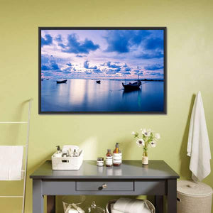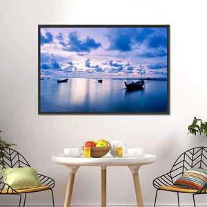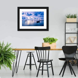 A lone fishing boat rests on a calm sea, with clouds overhead and soft reflections on the water in a blue and purple palette. The composition follows the rule of thirds to create a serene, tranquil mood that suits modern or coastal-inspired rooms.
