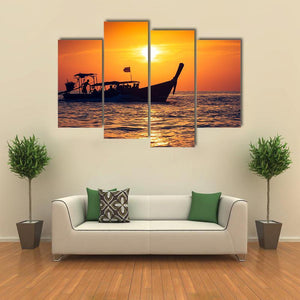 Fishing Boat In Phi Phi Islands shows a silhouetted fishing boat and people against a warm ocean sunset in Phi Phi Islands. The realistic landscape uses orange, yellow and blue tones, with sunlight reflecting on the water to create a serene, tranquil mood. Works well as wall decor in modern or island-inspired rooms.