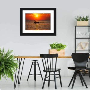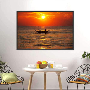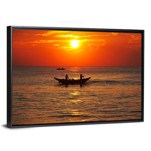 Capture the serene beauty of a sunset over the ocean with our Fishing Boat In Sri Lanka canvas print. This artwork features a central boat with two silhouetted figures, reflecting warm hues of orange and gold on tranquil waters. Ideal for any space seeking a peaceful atmosphere.
