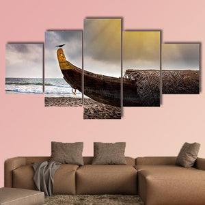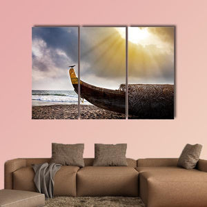 A realistic coastal scene of a crow perched on the bow of a boat, with sun rays breaking through clouds above the beach and sea. The rule-of-thirds composition and a muted palette of brown, blue, white, yellow and grey create a serene yet dramatic, natural mood. Pairs well with modern or coastal room decor in a home looking for a quiet, contemplative focal point.
