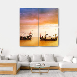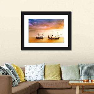 This canvas wall art features two wooden boats beside a serene beach, set against a dramatic cloudy sky. The warm palette of orange, purple, and yellow captures the tranquil beauty of a sunset, making it a perfect addition to any coastal-themed decor.