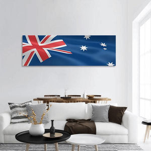 Flag of Australia Panoramic Canvas features the Australian flag rendered in blue, red, and white with a modern, patriotic feel. The rule-of-thirds composition and sense of motion give the piece contemporary energy. It suits modern interiors as a bold piece of room decor.