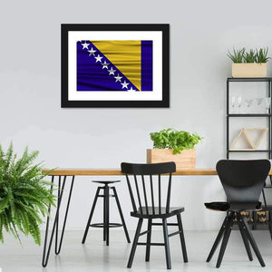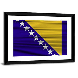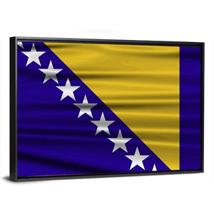 This canvas wall art features the flag of Bosnia & Herzegovina, embodying a patriotic spirit with a bold, graphic design. Its wavy texture effect and stylized stars create visual interest, making it a striking addition to any space.