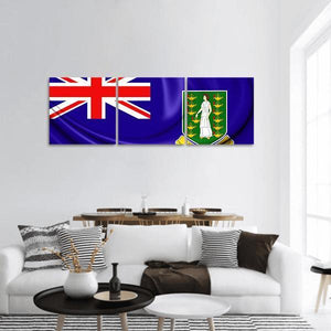 A bold, patriotic depiction of the British Virgin Islands flag that highlights the Union Jack and the coat of arms with the woman holding lamps. Rendered as colorful digital art with a symmetric composition and vivid blue, red, white, green, and yellow tones, it suits modern room decor and wall art displays.