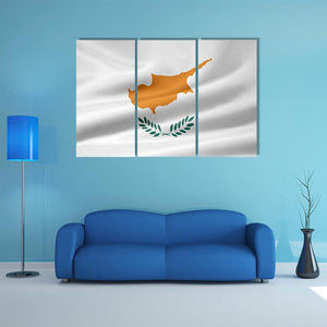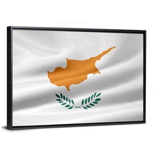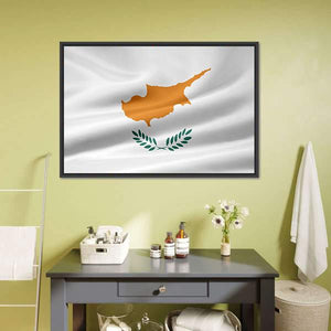 A realistic canvas print of the Cyprus flag, showing the copper-colored island outline and olive branches on a clean white field with the flag gently waving. The composition uses the rule of thirds for a balanced, elegant feel. It brings a patriotic, refined presence that suits modern home room decor and house walls.