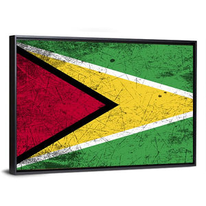 This canvas art showcases the bold Flag of Guyana, featuring a vibrant palette of red, yellow, green, white, and black. Its graphic design and weathered texture add character, making it a striking piece for any wall decor.