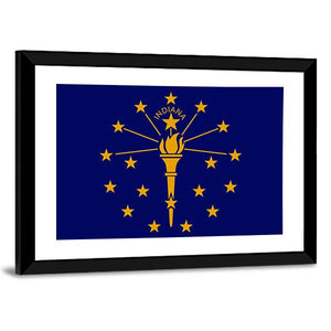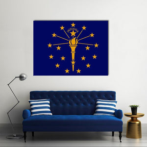 This canvas reproduces the Indiana state flag: a graphic, emblematic torch surrounded by 13 stars with the word "INDIANA" above. Rendered in blue and gold, it reads as patriotic and bold and suits modern home or room decor that favors clear state imagery.