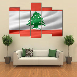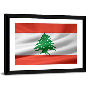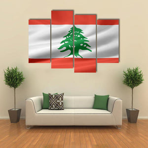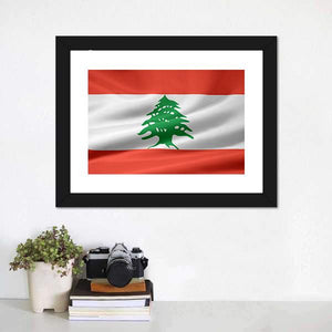 A realistic canvas print of the Lebanon flag, shown in a symmetric composition with bold red, white and green tones. The image suggests motion and a patriotic, vibrant mood, fitting well with modern home or room decor.