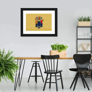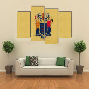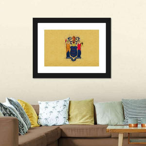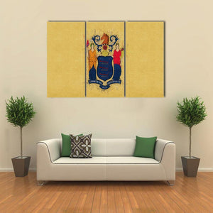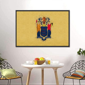 This New Jersey flag canvas shows the state emblem in a vintage, illustrative style with a formal, historical mood. Symmetrical composition and a palette of yellow, blue, red, green, and white highlight the central motto "LIBERTY AND PROSPERITY 1776." It works well on home or office walls and fits modern or patriotic decor.
