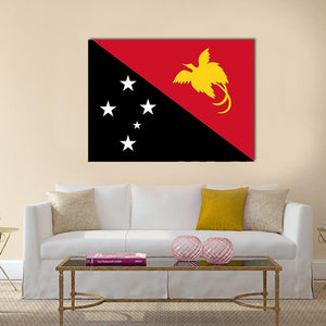 This canvas art features the bold national flag of Papua New Guinea, showcasing a striking diagonal split of red, black, yellow, and white. It includes a stylized yellow bird of paradise and five stars arranged in a Southern Cross pattern, making it an iconic piece that adds a symbolic touch to your decor.