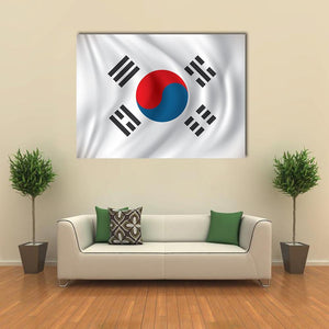 This modern canvas art beautifully depicts the flag of South Korea, evoking a patriotic and solemn atmosphere. Its symmetrical composition showcases a striking palette of white, red, blue, and black.