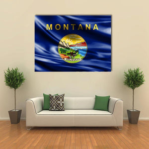 Celebrate the spirit of Montana with this canvas wall art featuring the state flag's emblem. Its vibrant palette of blue, gold, and green evokes a patriotic and stately atmosphere, making it a fitting addition to any room decor.