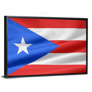 This canvas wall art features the Puerto Rico flag with red and white horizontal stripes and a blue triangle bearing a white star, presented in a clean, symmetrical composition. Its bold, patriotic tone and modern style work well in a house or contemporary living space as a graphic focal point.