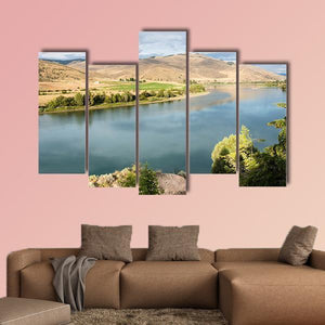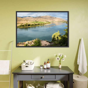 Flathead River in Montana presents a tranquil riverside scene with hills, trees, and a daytime sky. Soft blues, greens, browns and tan tones, plus the reflection in the water, create a calm, natural mood that works well in modern house and room decor.