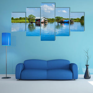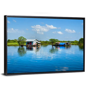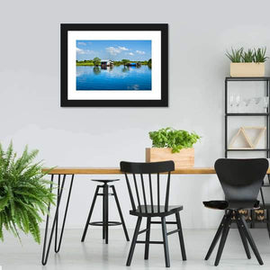 This serene piece features a floating house on a tranquil lake, surrounded by lush trees and a bright sky. The harmonious palette of blue, green, and white invites a peaceful atmosphere into any space.