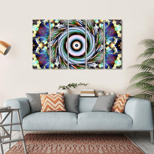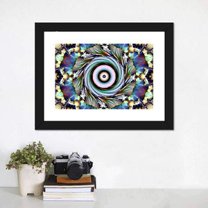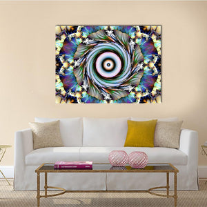 This abstract canvas features mesmerizing swirls and geometric patterns in a vibrant palette of blue, purple, white, and gold. Its intricate design and symmetrical composition make it an energetic addition to any space.