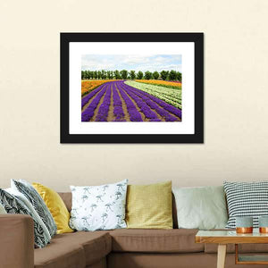 This canvas wall art captures the serene beauty of Hokkaido's flower fields. Featuring vibrant rows of purple, white, and orange flowers extending into the distance, it brings a peaceful touch of nature to any space.