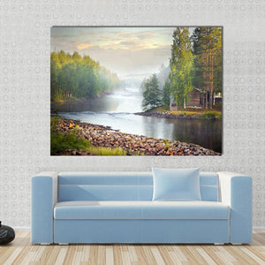 This serene canvas art features a misty river scene, showcasing a rustic wooden cabin nestled among lush green forests and rocky riverbanks. With its tranquil palette of blues, greens, and browns, it brings a peaceful vibe to any space.