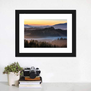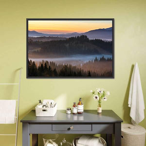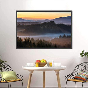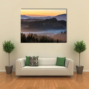 Fog Over Carpathian Mountains depicts mist-filled valleys, distant peaks and stands of pine trees at sunrise in a realistic landscape. Soft oranges, cool blues and earthy greens lend a serene, ethereal atmosphere. It fits well in home living spaces and modern interiors as a calm focal piece.
