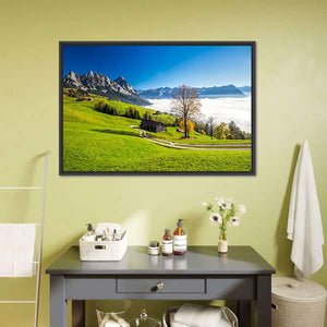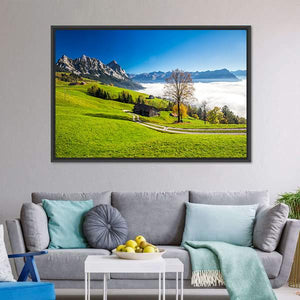 A realistic mountain landscape showing rolling green hills, a small cabin by a lake, a solitary tree and a winding path disappearing into a sea of clouds. Soft blues, greens, browns and white fog give the scene a serene, picturesque autumn mood with snow-capped peaks on the horizon. This calm nature scene works well as wall decor in modern rooms or living spaces.