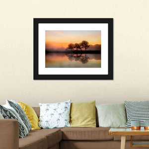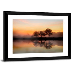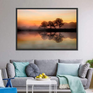 Foggy Autumn Sunrise Canvas Wall Art shows a quiet autumn sunrise over a foggy lake with trees and their reflections softened by mist. Warm oranges and cool blues blend through wispy clouds and soft fog, creating a calm, peaceful atmosphere that suits modern or minimalist rooms.