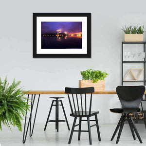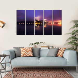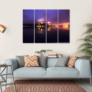 This enchanting canvas art features a serene view of Bled Lake, capturing the mystery of a foggy sky. The reflections on the water and soft palette of purple, yellow, and dark blue evoke a romantic, tranquil atmosphere, perfect for enhancing your space.