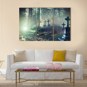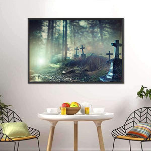 Foggy Graveyard Canvas Wall Art shows a mist-shrouded graveyard with stone crosses, tombs, and trees. Green, blue, grey, and white tones plus a subtle glowing light give the scene an eerie, mysterious, and tranquil mood. It suits modern rooms or dark fantasy–style spaces as moody wall decor.
