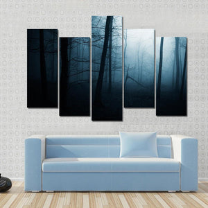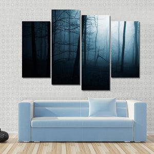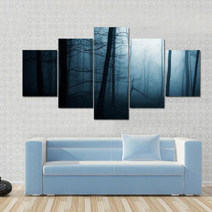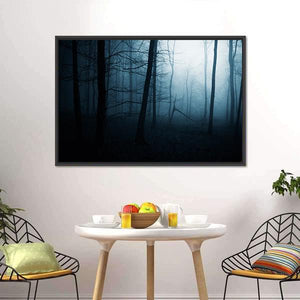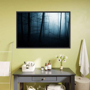 This eerie artwork captures a dark forest shrouded in dense fog. The interplay of bare branches and a moody palette of dark blues and blacks creates a mysterious atmosphere, making it perfect for lovers of gothic and dramatic décor.