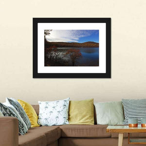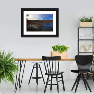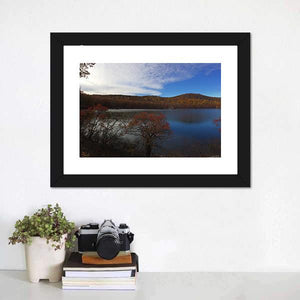 Foliage Lake Panoramic Canvas Wall Art depicts a photorealistic lakeside scene with autumn foliage, a forested shore, and a cloudy sky, creating a serene, natural atmosphere. The calm blue, green and brown palette pairs well with modern room decor like living rooms or bedrooms.