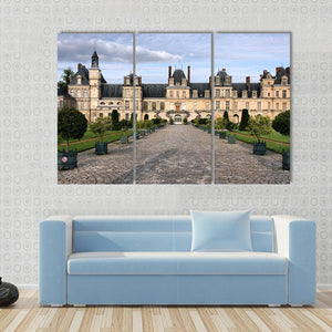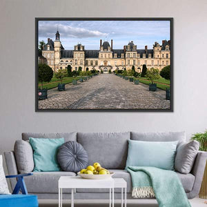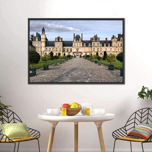 This canvas artwork captures the elegance of Fontainebleau Castle, surrounded by its serene gardens and stately pathways. With a realistic style and a balanced color palette of beige, gray, green, and blue, it brings a grand and tranquil atmosphere to any space.