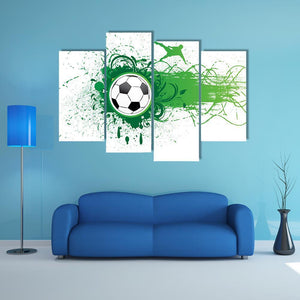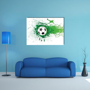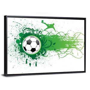 This abstract canvas art features an energetic soccer theme, showcasing a vivid green paint splatter background with a centrally placed soccer ball. A dynamic silhouette of a soccer player kicking adds modern flair to any space.