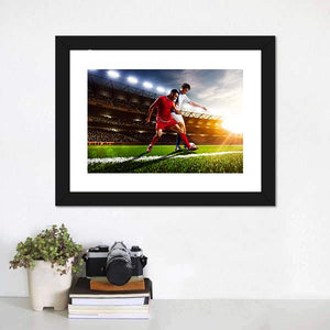 This dynamic canvas art captures two soccer players in action against a vibrant stadium backdrop. The energetic scene, illuminated by bright sunlight, conveys a competitive spirit that is perfect for sports enthusiasts.