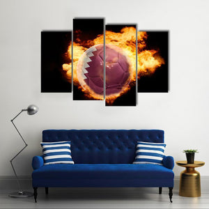 This vibrant artwork features a soccer ball adorned with the Qatar flag, dramatically engulfed in flames. The intense palette of red, white, orange, and black brings an energetic vibe, making it a striking addition to any space.