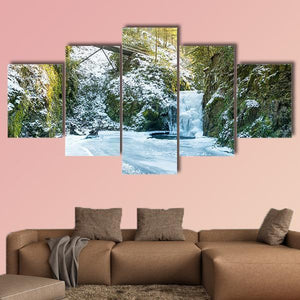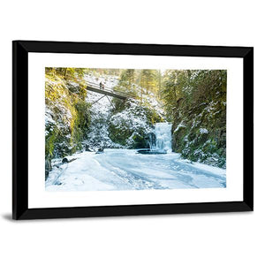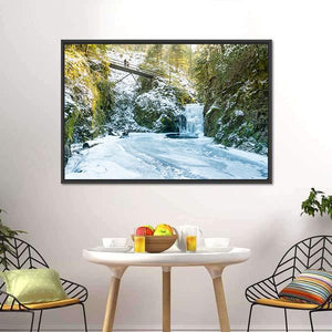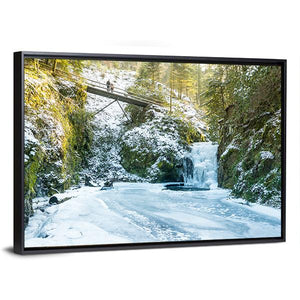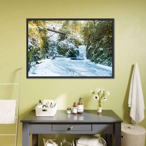 Baden In Winter Canvas captures a winter landscape with a waterfall, snow‑covered forest, an icy river in the foreground, and people on a bridge. The scene feels serene and quietly cold, rendered in blues, whites, greens, and browns that emphasize a natural mood. Suits nature-focused or modern interiors as calming wall decor.