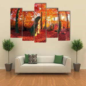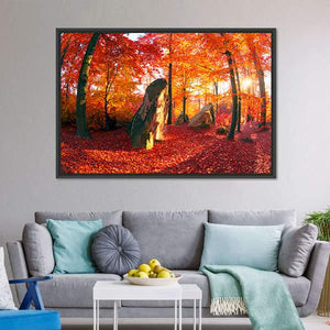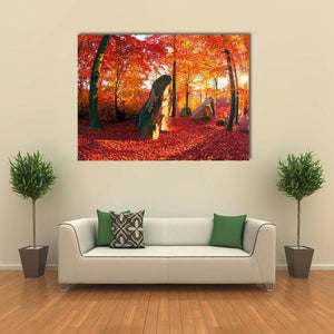 An autumn forest scene from the Carpathians with fallen leaves, sunlight filtering through trees, and large stones scattered across the floor. The realistic, warm palette of orange, red, brown and yellow creates a vibrant yet peaceful mood. This nature-focused canvas works well in modern home interiors and room decor that favor serene landscapes.
