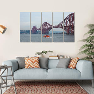 This canvas art captures the iconic Forth Bridge in Scotland, showcasing its remarkable cantilever design alongside an orange boat against a calm water backdrop. The industrial vibe and realistic portrayal make it a striking addition to any wall.