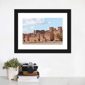 This canvas art depicts ancient architecture nestled within a serene desert landscape, showcasing mud brick structures and scattered palm trees. With its rich palette of tan, brown, and blue, it brings a historic and tranquil vibe to any space.